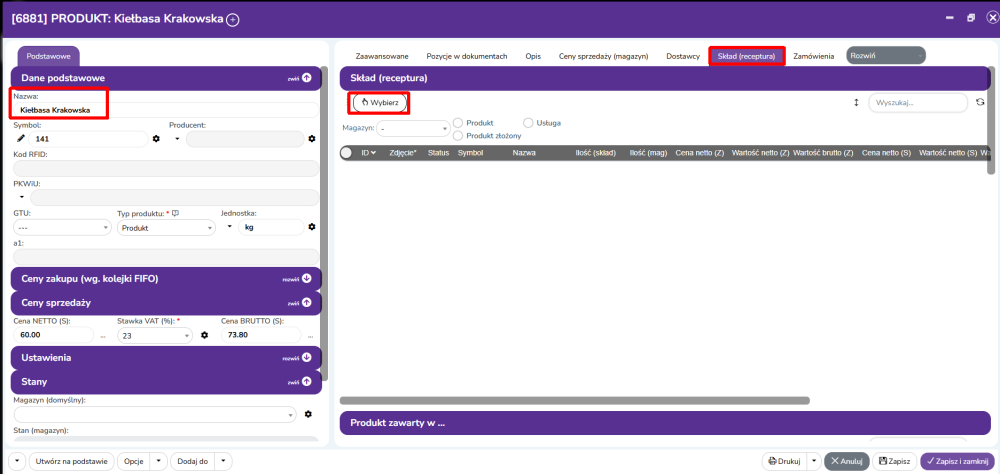 Po otwarciu okna produktu uzupełniamy dane, takie jak nazwa, jednostka, cena itp., a następnie przechodzimy do zakładki Skład (receptura). Tam klikamy Wybierz i z magazynu wybieramy składniki, z których produkt się składa.