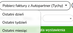 Po zakończeniu konfiguracji przechodzimy do modułu Zakup. Tam dostępny będzie przycisk Pobierz faktury z możliwością wyboru zakresu czasowego: ostatni dzień, tydzień lub miesiąc. Za jego pomocą możemy pobrać wszystkie faktury z wybranego okresu.