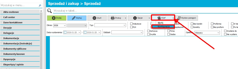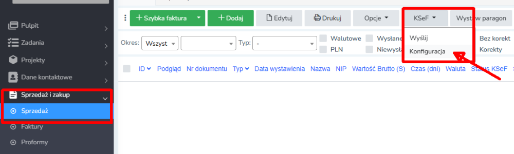 Sprzedaż → Zakup/Sprzedaż/ następnie przycisk KSeF w kolejnym kroku należy wprowadzić kod w ustawieniach