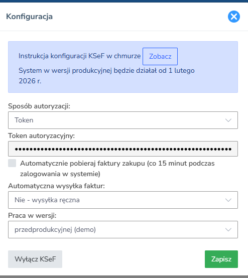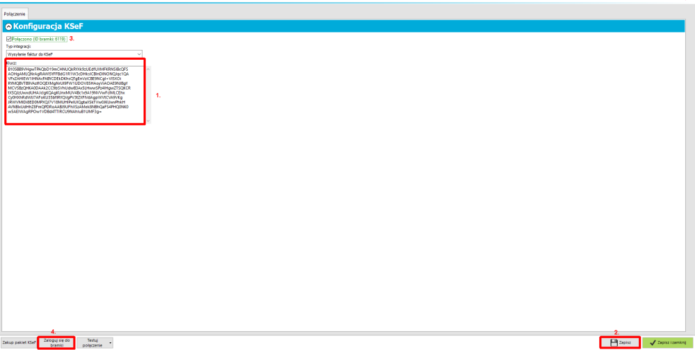 2. W konfiguracji, w polu „Klucz”, należy wkleić kod połączenia z KSeF, a następnie kliknąć przycisk „Zapisz”.
