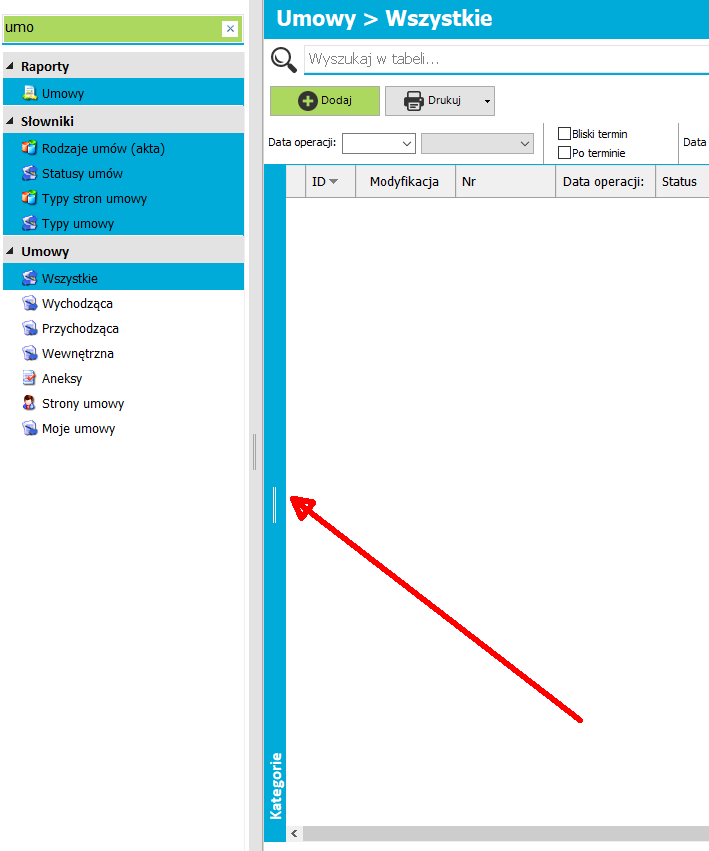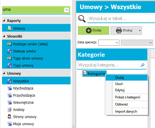 2025-10-08 12:58:15Aby dodać kategorię w wybranym module, na przykład Umowy, należy przejść do modułu Umowy, a następnie rozwinąć zakładkę Kategorie.