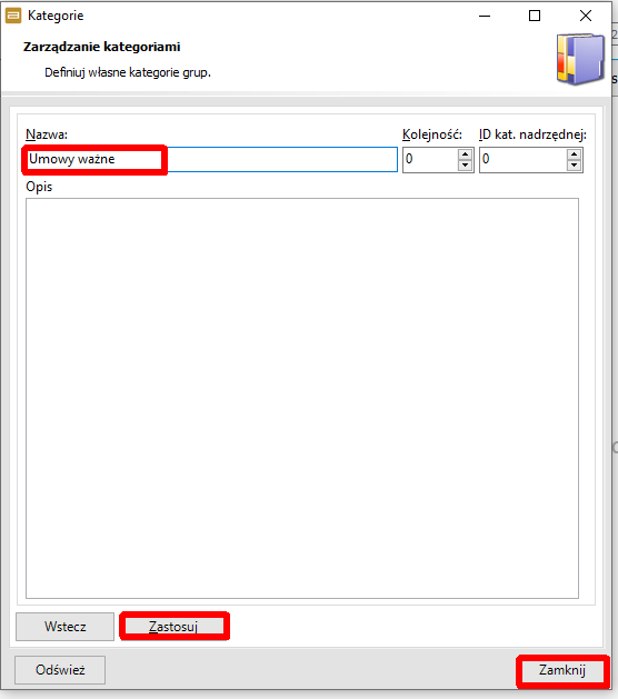 Wprowadź nazwę kategorii, a następnie kliknij Zastosuj i Zamknij.