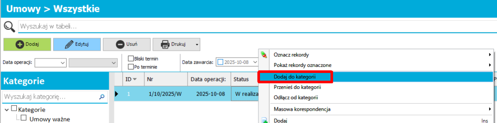 Zaznacz umowę, kliknij prawym przyciskiem myszy, wybierz Dodaj do kategorii, wskaż odpowiednią kategorię i kliknij Wybierz.