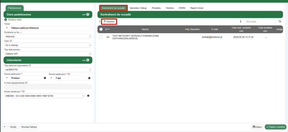 WAŻNE! W przypadku gdy faktura ma zostać wysyłana automatycznie, opcja Wyślij e-mail musi być zaznaczona (znajduje się ona w danych podstawowych).