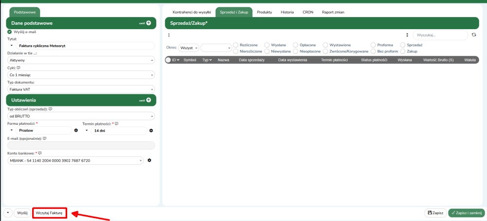 4. Po wczytaniu faktury jej zawartość będzie widoczna w zakładce PRODUKTY, natomiast w zakładce SPRZEDAŻ/ZAKUP pojawi się faktura, która zostanie wysłana według cyklu.
