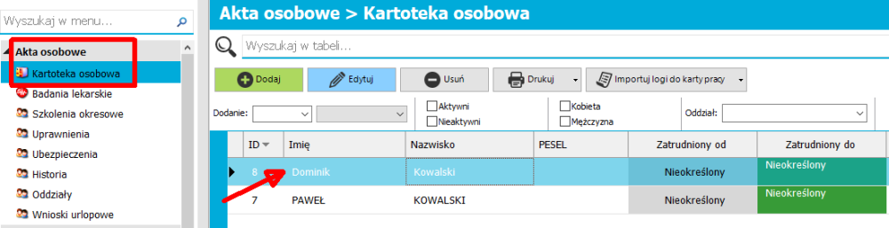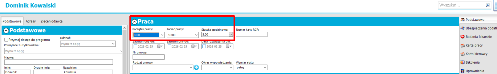 Przejdź do Akta osobowe → Kartoteka osobowa, wybierz pracownika i otwórz zakładkę Podstawowe.