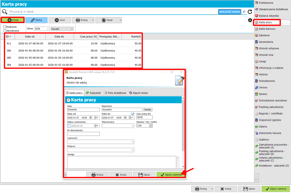 Następnie przejdź do zakładki Karta pracy, kliknij Dodaj i wprowadź dla każdego dnia zakres czasu pracy (od–do).