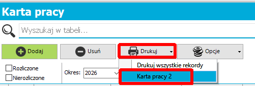 Wybierz Drukuj → Karta pracy 2, wskaż miesiąc oraz rok, za który ma zostać przygotowany wydruk.