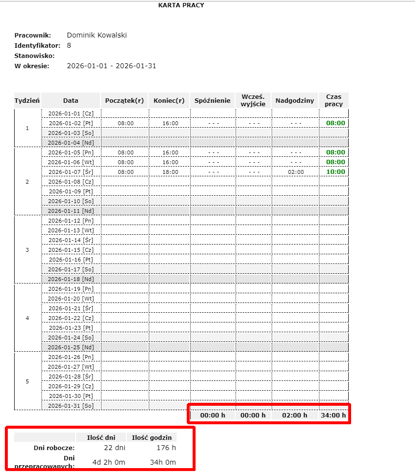 System wygeneruje kartę pracy z podsumowaniem przepracowanych godzin oraz wyliczeniem należności na podstawie stawki godzinowej.