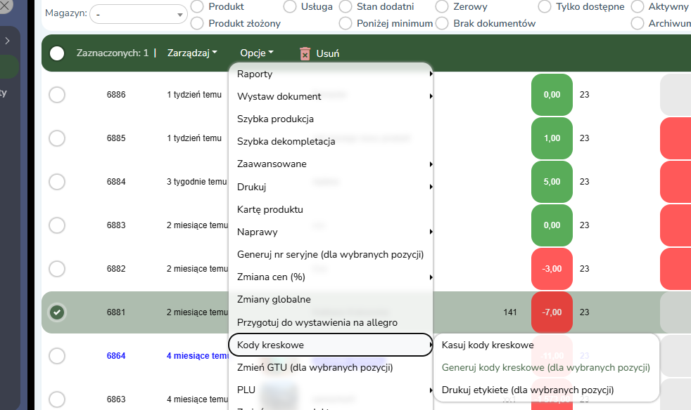 Nadanie kodu kreskowego dla pozycji na indeksie magazynowym