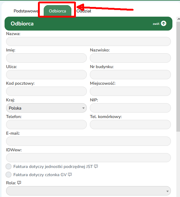 2026-04-16 08:18:08Aby dodać Odbiorcę na fakturze (tak, aby widoczny był zarówno nabywca, jak i odbiorca), należy w formularzu faktury, po lewej stronie w sekcji „Podstawowe”, przejść do zakładki „Odbiorca”, a następnie uzupełnić wymagane dane.