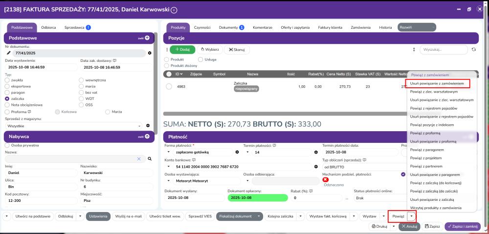 Powiązanie faktury za zamówieniem / jak usunąć