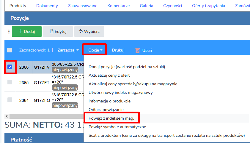 Powiązanie produktu z faktury zakupu z indeksem magazynowym