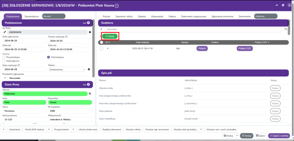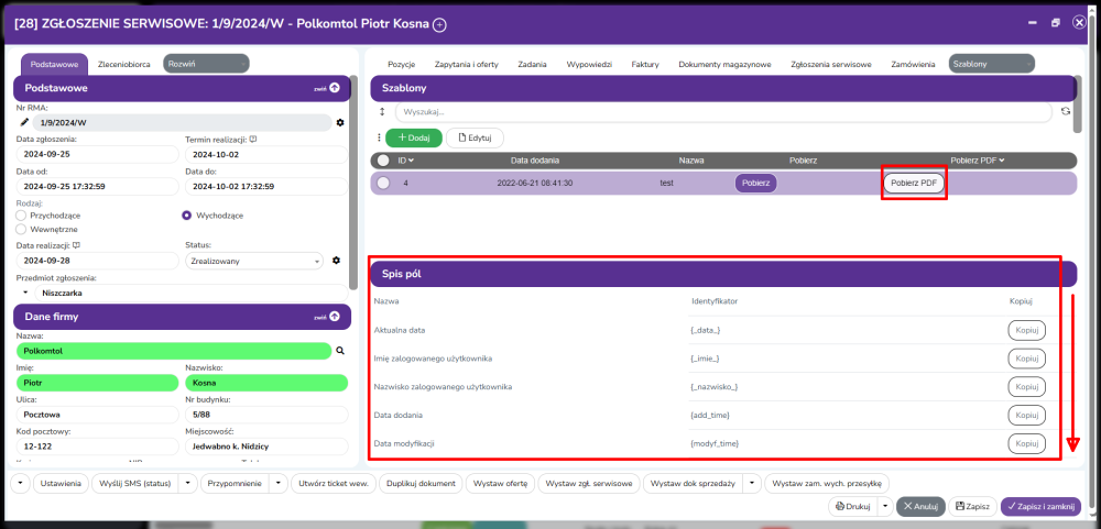 W momencie pobrania szablonu Asystent go wypełni danymi z formularza.