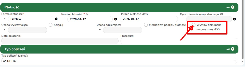 2026-04-07 11:22:10Faktura zakupowa zaimportowana z KSeF nie powoduje automatycznego przyjęcia towaru na magazyn. Aby dodać produkty do magazynu, należy wejść w edycję tej faktury, a następnie w dolnej części okna – w sekcji płatności – zaznaczyć opcję „wystaw dokument magazynowy PZ”.