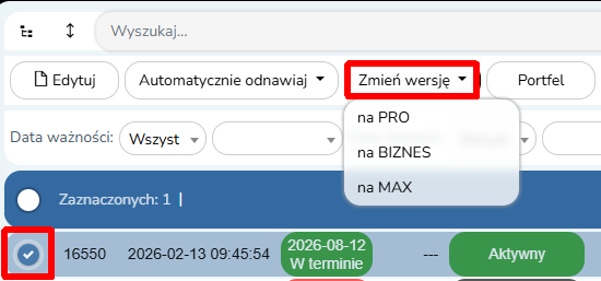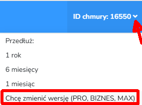 W Panelu Klienta należy zaznaczyć odpowiednią chmurę, a następnie kliknąć opcję Zmień wersję i z dostępnej listy wybrać wariant PRO, BIZNES lub MAX.